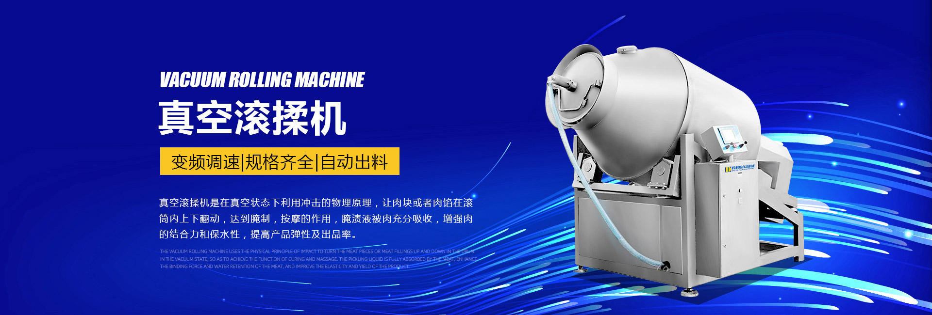 公司主要生產(chǎn)不銹鋼制品食品機(jī)械:各種規(guī)格型號(hào)真空滾揉機(jī)、制冷滾揉機(jī)、提升機(jī)、電加熱夾層鍋、肉丸機(jī)、真空攪拌機(jī)、絞肉機(jī)、灌腸機(jī)、打卡機(jī)、線扎機(jī)、斬拌機(jī)、鹽水注射機(jī)、煙熏爐、油炸機(jī)、巴氏殺菌線、連續(xù)油炸線、肉丸成型水煮線、醬鹵生產(chǎn)線、肉丸破碎機(jī)、真空包裝機(jī)、洗袋風(fēng)干機(jī)、豬頭劈半機(jī)、不銹鋼火腿模具、肉斗車、案桌、煙熏車、屠宰類機(jī)械設(shè)備、清洗風(fēng)干設(shè)備、肉類解凍設(shè)備、滾筒拌料機(jī)等。產(chǎn)品廣泛適用于火腿腸、肉丸、肉串、鹵制品、海產(chǎn)品、禽類深加工、油炸、泡椒風(fēng)味、速凍水餃、魚豆腐、千葉豆腐、豆腐干、牛肉干、牛排雞排類、禽蛋、麻辣、休閑、水果蔬菜清洗、中央廚房、餐飲連鎖、寵物食品等食品生產(chǎn)。